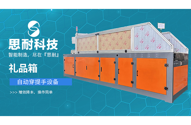 礼品箱型全自动穿塑料提手机,只需一人放纸箱,放联排提手,可替代20人人工,操作简单,高效稳定。可添加视觉检测系统和码垛整理装置,更省成本。